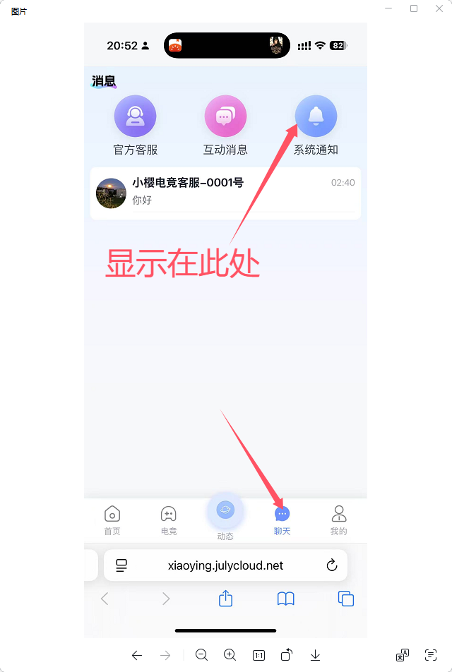 系统通知是显示在此处:首页→聊天→系统通知里