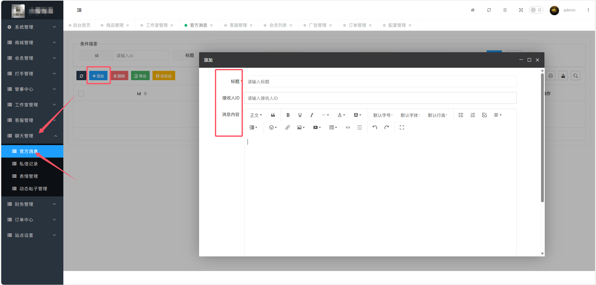 在聊天管理-》官方消息-》